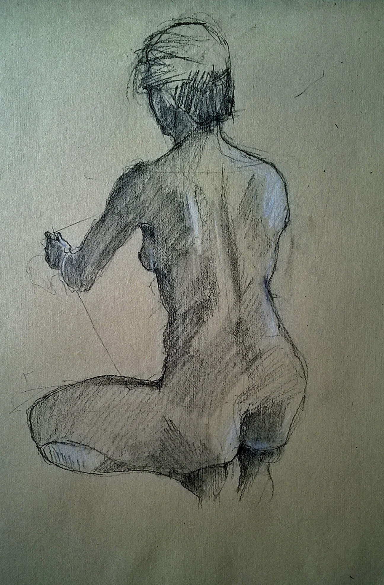Finding a model was hard. The nearby beach offered multiple opportunities for bodies, but sketching in a crowd was too much of a side show. Getting a total stranger to pose nude in the front room was unthinkable and not even friends (who are usually willing to pose nude) want to model when they understand that it means sitting around for hours without moving. They were happy to do it at the beach but then we were back to square one. In the end, it was easier to draw myself.